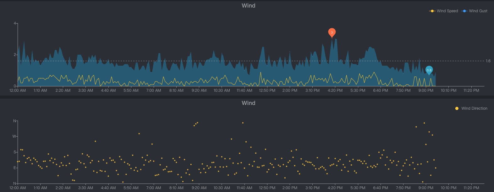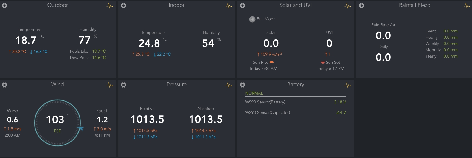 - 觀測資料每5 min上傳至雲端平台(https://www.ecowitt.net/),具有手機APP可即時查看(Ecowitt),並可上傳至第三方開放氣象圖台(Weather Underground),獲取API供計畫整合圖台介接。
